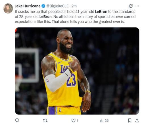 半场打完美记Jake Hurricane写道:人们居然在用41岁的勒布朗与28岁的勒布朗作比较,这让我忍俊不禁。在体育史上没有哪一位运动员受过如此之高的期望,单凭这一点足以说明他是历史最伟大的球员。
