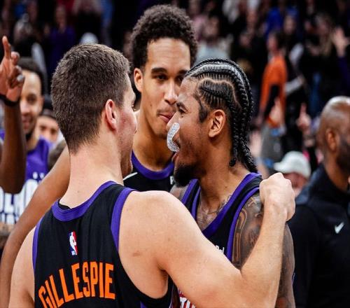 这也是为什么,双加时的最后一攻,球给到杰伦·格林的时候,太阳队替补席是那种表情了。全场比赛,杰伦·格林出场37分钟,得到了16分7篮板5助攻3抢断。罚球命中率都只有33%,足以看出杰伦·格林今天的表现有多么糟糕了。当然,也不只是杰伦·格林,今天太阳全队的表现都称不上正常。全场比赛,太阳队的命中率仅有34.2%,三分命中率不足30%,罚球命中率70.8%,真实命中率44.3%,这样的投篮命中率和真实命中率,是NBA本赛季至今,所有获胜的比赛场次中最低的。所以可以这么说,杰伦·格林的这个绝杀三分,拯救了太阳队,也拯救了他自己。