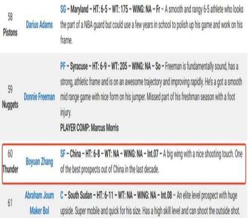 据美国选秀媒体NBA Draft Room的最新2027年NBA选秀预测,张博源将会在第六十顺位,也就是第二轮最后一位被雷霆队选中。