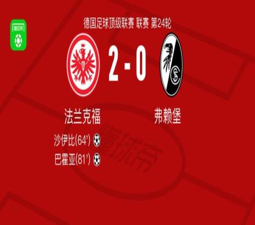 北京时间3月2日德国足球顶级联赛 联赛 第24轮,法兰克福主场对阵弗赖堡。法兰克福沙伊比破门,巴霍亚破门。最终比分法兰克福 2-0 弗赖堡。