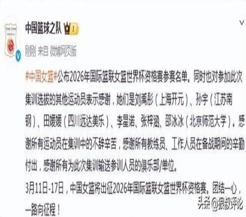 公布2026年国际篮联女篮世界杯资格赛参赛名单。同时也对参加此次集训选拔的其他运动员表示感谢,她们是刘禹彤(上海开元)、孙宇(江苏南钢)、田媛媛(四川远达美乐)、李星诺、张梓涵、邵冰冰(北京师范大学)。感谢所有运动员在集训中的不辞辛苦,感谢所有教练员、工作人员在备战期间的辛勤付出,感谢所有为此次集训输送参训人员的俱乐部/单位。