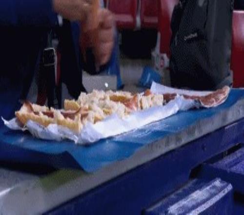 第45+2分钟,看饿了吗?半场结束前马竞球迷在看台上现场制作三明治