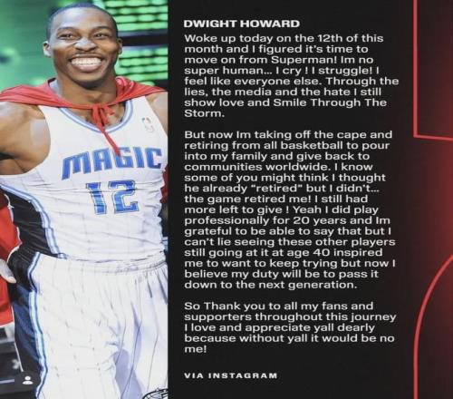 “魔兽”霍华德发布长文宣布脱下超人战袍,正式结束自己的球员生涯......