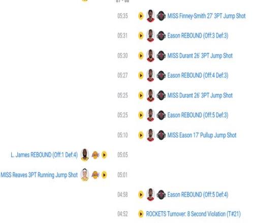 终场前4分52秒杜兰特8秒不过半场低级失误,也是这个失误让艾顿篮下补篮帮助湖人反超,终场前3分32秒杜兰特又是一个想要穿过两人包夹的传球失误,不得不说KD这一波令人很无奈,短短118秒里2铁+2失误。