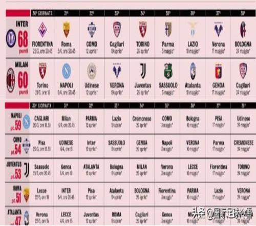相对而言,国米最后阶段要对阵佛罗伦萨等拼保级的球队,要对上罗马、科莫等为欧冠资格玩命的球队。AC米兰则要同那不勒斯、尤文图斯、亚特兰大等多支争夺欧战资格的对手捉对厮杀。