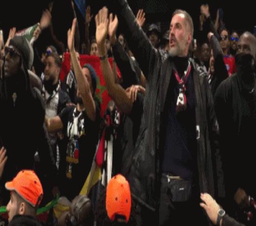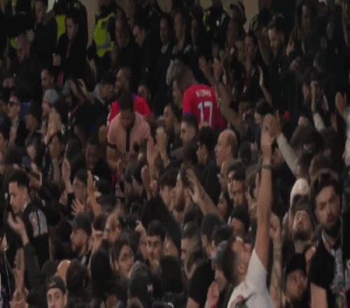 第54分钟,比分领先,巴黎球迷兴高采烈高声歌唱