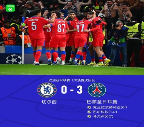北京时间3月18日欧洲冠军联赛 1/8决赛次回合,切尔西对阵巴黎圣日耳曼。巴黎圣日耳曼克瓦拉茨赫利亚破门,巴尔科拉破门,马尤卢破门。最终比分切尔西 0-3 巴黎圣日耳曼。两回合总比分切尔西2-8巴黎圣日耳曼。