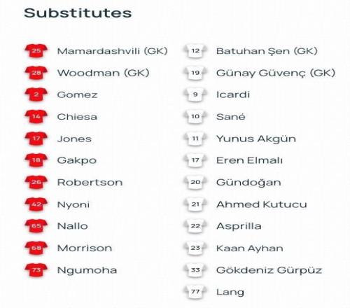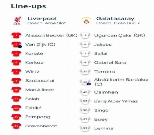加拉塔萨雷首发:1-恰基尔、93-博埃、90-辛戈、42-巴尔达克奇、4-雅各布斯、34-托雷拉、99-勒米纳、7-罗兰-绍洛伊、8-萨拉、53-伊尔马兹、45-奥斯梅恩