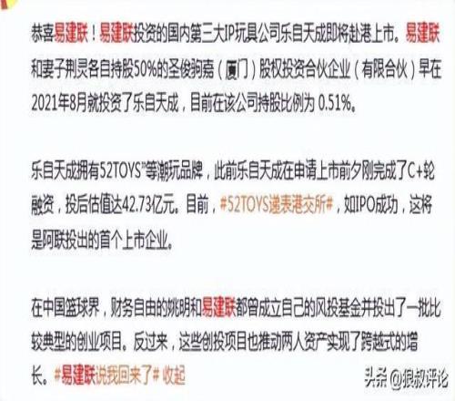去年,根据国内媒体的报道,易建联投资的国内第三大IP玩具公司乐自天成即将赴港上市。易建联和妻子荆灵各自持股50%的圣俊驹嘉(厦门)股权投资合伙企业(有限合伙)早在2021年8月就投资了乐自天成,目前在该公司持股比例为 0.51%。