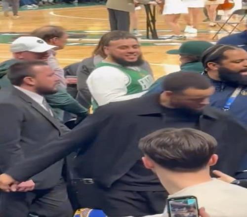 此役,金州勇士球星斯蒂芬-库里因膝伤继续缺阵,半场结束后,库里走向球员通道准备返回更衣室,此时遭到一位凯尔特人主场球迷的拉拽,保镖立刻上前解围,库里也满脸不悦轻微摇头。这位球迷随后被驱逐出场。