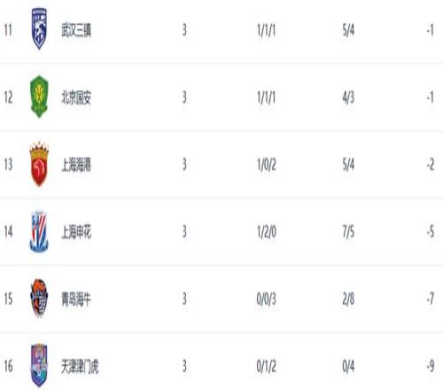 津门虎以-9分在积分榜上垫底,三连败的青岛海牛则以-7分排名第15位,海港(-2)、申花(-5)分别排名第13、第14位。