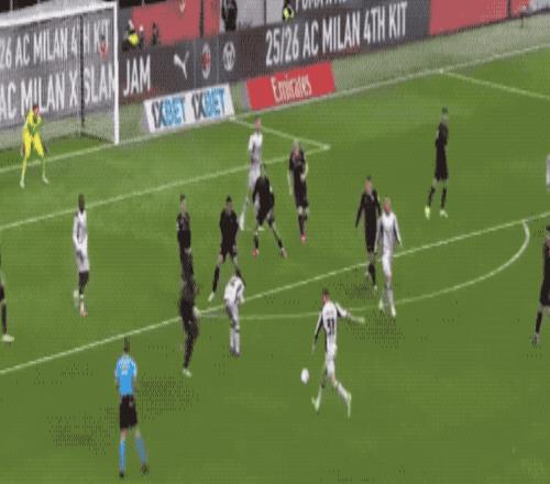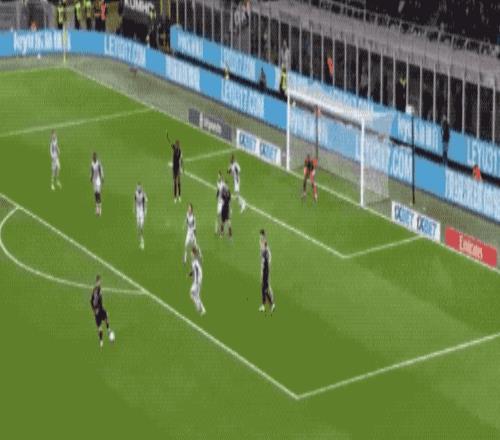 第36分钟,帕夫洛维奇外脚背撩射,皮球划过一道优美的弧线,越过门将头顶,米兰取得领先。