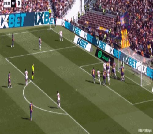 第24分钟,坎塞洛角球助攻,阿劳霍头球弹立柱入网,巴萨1-0领先!