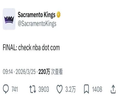 但是本场被黄蜂打爆后,国王官方只在社媒上这么写道:最终结果请见NBA官网。