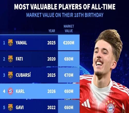 德转历史18岁球员生日当天身价榜:伦纳特卡尔6000万欧元第4