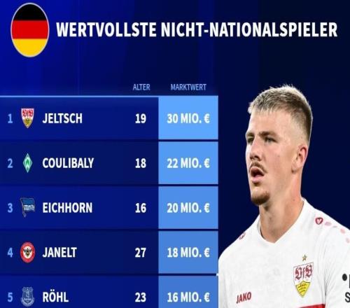 从未入选德国队球员身价榜:斯图加特后卫耶尔奇3000万欧居首