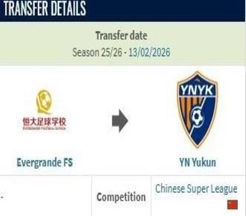 德转:云南玉昆约100万人民币从恒大足校签下布尼亚明