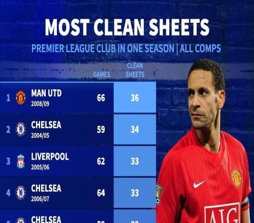 英超球队单赛季零封榜:0809赛季曼联66场36次零封排名第一