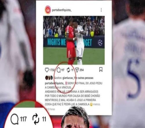 世体:因为与维尼修斯交换球衣,本菲卡球迷要求开除卡布拉尔