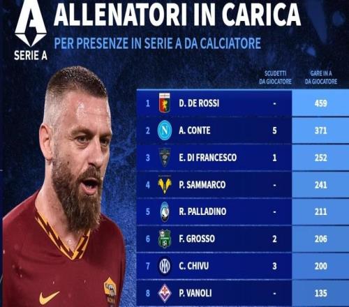 意甲现任主帅球员生涯意甲出场数排名:德罗西、孔蒂前二