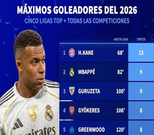 2026年五大联赛球员各项赛事进球榜:凯恩13球第1,姆巴佩第2