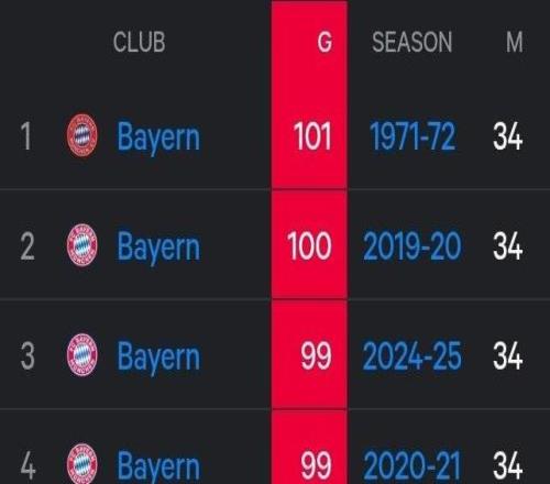 拜仁距离德甲单赛季进球纪录仅差10球,而联赛还剩9轮