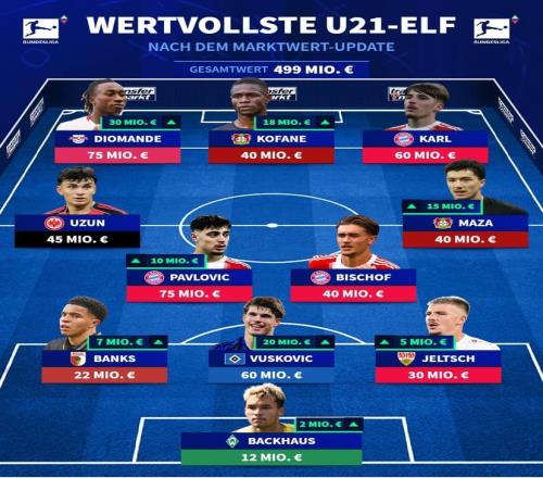 德甲最贵U21阵容:迪奥曼德、帕夫洛维奇、卡尔、马扎在列