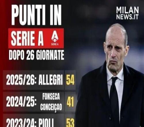 米兰本赛季意甲前26轮拿到54分,为近8个赛季同期第二高积分