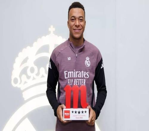 荣耀时刻,姆巴佩在训练基地领取了皇马1月最佳球员奖杯