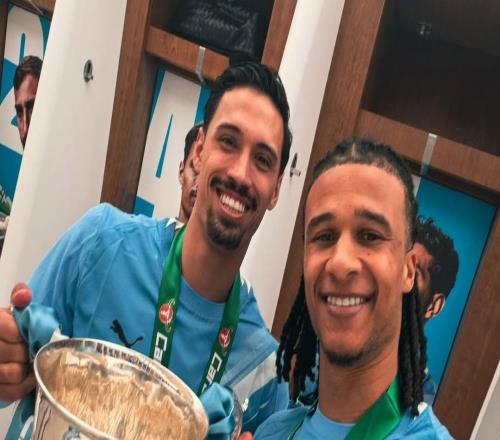 赖因德斯晒与奖杯合照:很自豪在这里赢得曼城生涯首冠