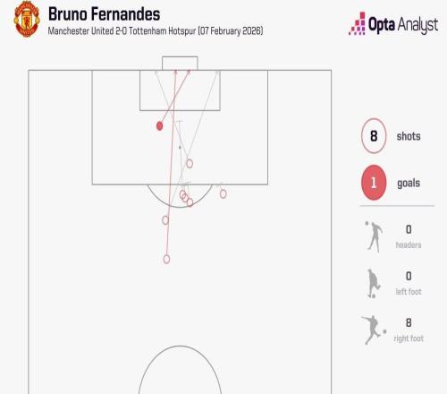 B费英超单场参与14次射门,自2024年10月的萨卡以来最多