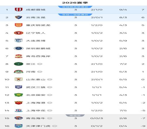 中超第3轮积分榜:西南F3继续领跑,“上青天”三队排名榜尾